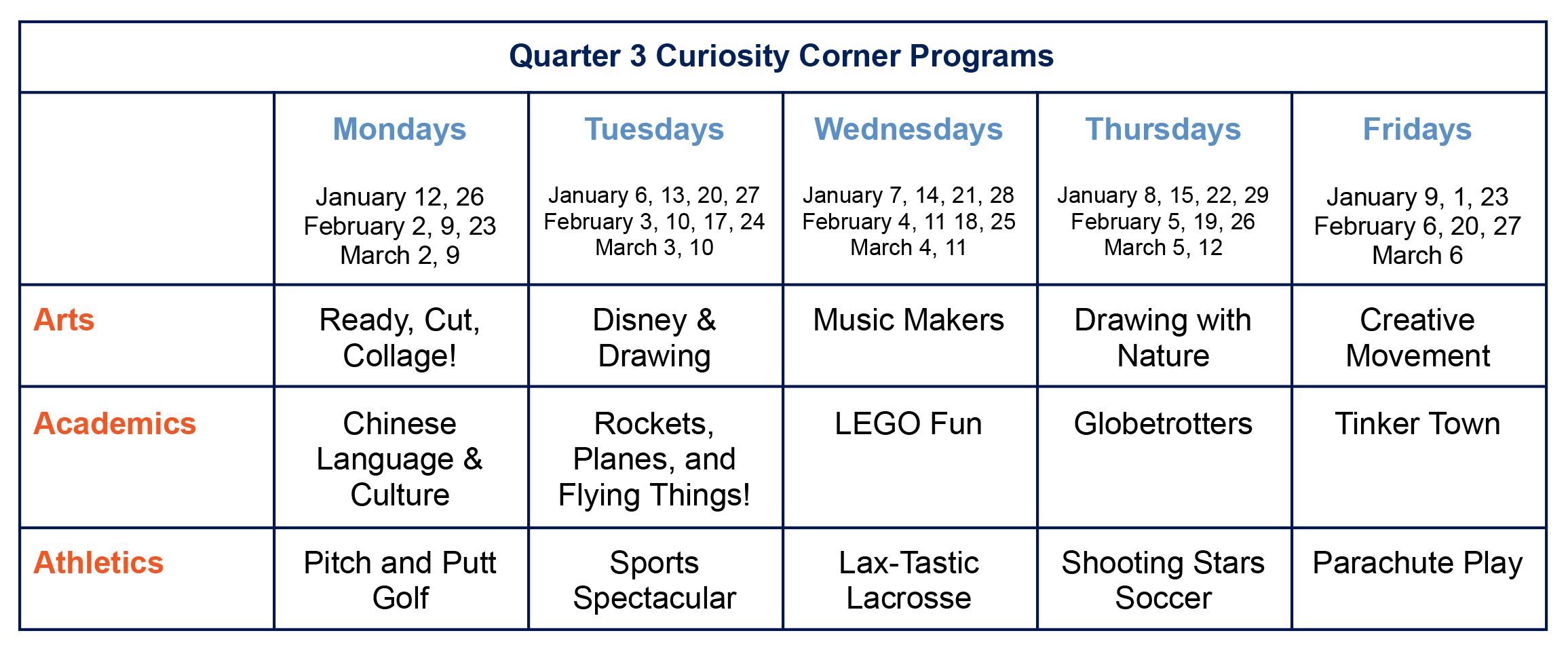 Students signed up for Curiosity Corner can look forward to participating in all three programs listed for each weekday during Quarter 3: